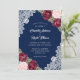 Elegante y rústica invitación a una boda floral con flores color azul marino, burdeos y rosa oscuro con aliento de bebé, rosas borgoñas y rosas rosas rosas rosas rubias sobre un fondo dorado azul marino adornado con encaje floral blanco. Diseño de tarjeta perfecto para invitar a sus invitados a su fiesta de bodas rústica azul marino, borgoña y ondulada. Elementos coincidentes disponibles.