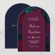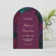 Una invitación de boda floral de tono de joya lujosa con arco que presenta ricas flores de color burdeos, púrpura y verde bellamente dispuestas alrededor de un elegante marco arqueado sobre un fondo azul profundo. El audaz diseño botánico y la dramática paleta de colores crean un look romántico y sofisticado perfecto para ceremonias formales, celebraciones nocturnas y bodas de jardín con estilo. Esta invitación única con forma de arco añade un toque moderno mientras destaca las flores vibrantes y la elegancia atemporal.