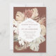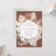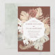 Elegantes y modernas invitaciones a bodas tropicales con detalles bodas enmarcados por un borde de flores acuáticas y follaje tropical en tonos termales, beige, óxido, marrón, salvia y verde oscuro con un fondo marrón. Las únicas invitaciones a bodas tropicales se revierten a un fondo color agua verde sabio.