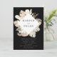 Elegantes y modernas invitaciones a bodas tropicales con nombres de bodas rodeados de un marco cuadrado de flores acuáticas y follaje tropical en tonos tierra de blanco, tostado, beige, óxido, marrón, sabio y verde oscuro. Personalice la invitación añadiendo los detalles de su boda debajo en texto blanco con un fondo negro. Las invitaciones a bodas tropicales se revertirán a un fondo color agua verde sabio.