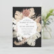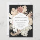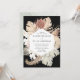 Elegantes y modernas invitaciones a bodas tropicales con detalles bodas enmarcados por un borde de flores acuáticas y follaje tropical en tonos termales, beige, óxido, marrón, salvia y verde oscuro con un fondo negro. Las únicas invitaciones a bodas tropicales se revierten a un fondo color agua verde sabio.