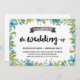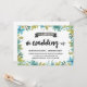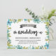 Esta invitación a una boda con temática de jardín trasero cuenta con un hermoso borde de flores azul y verde, caligrafía de guion de pincel de bonito y una rústica pancarta de pizarra de moda.