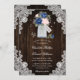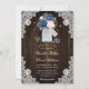 Rústica invitación a bodas floridas de color azul marino y ruidosa con un ramo de rosas azules y ruidosos, aire de bebé y vegetación dentro de un frasco de albañil contra un fondo de madera de granero adornado con encaje floral blanco y luces de centelleo. Diseño de tarjeta perfecto para invitar a sus huéspedes a su fiesta de bodas rústico de campo azul marino y ruidoso.