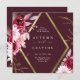 Celebre un romántico boda de otoño con esta elegante invitación floral con marco geométrico de diamante dorado, dahlias burdeos de color agua, peonías onduladas y follaje rústico de otoño. Perfecto para bodas al aire libre, bohemias o bodas de campo con un toque acogedor y vintage.