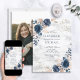 Moderna y de moda, esta magnífica invitación a la boda presenta una hermosa acuarela de rosa de flores de color azul marino y rosa rubí, sobre un fondo de mármol de imitación carrera con follaje rosa y falsos copos de oro, y texto azul marino. La parte posterior de la tarjeta muestra su foto de compromiso de orientación vertical favorita. Copyright Elegant Invita. Todos Los Derechos Reservados.
