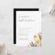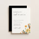 Fruta cítrica naranja acuarela y floral. Invitación de boda minimalista chic contemporánea. Tipografía negra sobre fondo blanco con respaldo de color negro.
