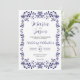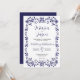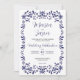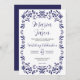 El elegante diseño de la Invitación a la Boda Elegante Floral de Lavanda Azul de la Marina Mexicana presenta un borde simétrico de estilizados motivos florales y de hojas en tonos azul marino y lavanda suave, creando un caudal elegante alrededor de los bordes. La decoración se compone de lágrimas, flores y acentos de estrellas que le confieren un aspecto refinado y decorativo. El fondo blanco limpio del centro ofrece un espacio equilibrado para insertar mensajes de texto o personales, lo que lo hace ideal para invitaciones o invitaciones formales.