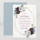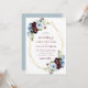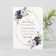 Un diseño floral polvoriento azul y borgoña con un marco geométrico dorado con texto en el medio. Las flores color burdeos, rosa y azul marino son perfectas para las bodas de verano, invierno y otoño. Puede cambiar la redacción, el tamaño del texto, el color y la fuente de esta plantilla.