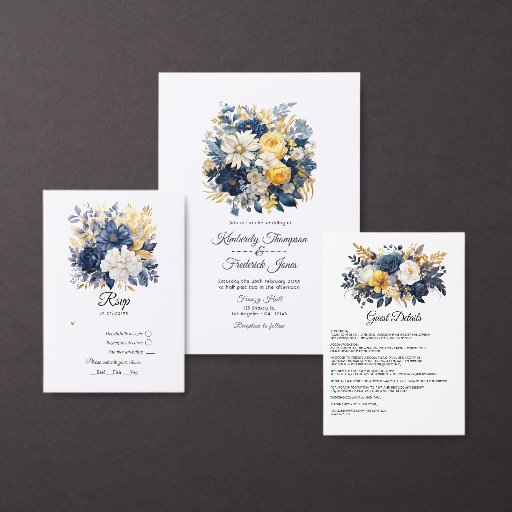 Personalizable de invitación a la boda floral azul marino, blanca y dorada a los detalles de tu evento.