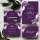 Esta elegante boda, salvo la tarjeta de fecha, tiene ramos de flores moradas y lilas, con vegetación de imitación de Relieve metalizado plateado en dos esquinas, sobre un fondo morado. El texto del personalizable combina serif de color gris plateado, cursiva y letra manuscrita. El reverso presenta un diseño floral color púrpura, lila y plateado a juego.
