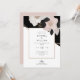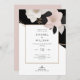 Elegante invitación a bodas inspirada en Chanel con flores rosadas y follaje contra un dramático telón de fondo negro. Una mezcla de lujo, sofisticación y romanticismo.