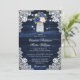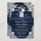 Rústica invitación a bodas floridas de color azul marino y ruidosa con un ramo de rosas de la armada y el rubor y flores de aliento de bebé dentro de un frasco de albañil contra un fondo de madera de granero adornado con encajes florales blancos y luces de cuerdas. Diseño de tarjeta perfecto para invitar a sus huéspedes a su fiesta de bodas rústico de campo azul marino y ruidoso. Personalice fácilmente esta invitación de boda con los detalles de su boda en línea. Diseño de personalizable completo. Elementos coincidentes disponibles.