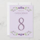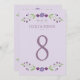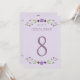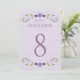 Las tarjetas número de tabla boda de moda rústica presentan un marco floral simétrico de lavanda, lila, violeta y ciruela con hojas botánicas verdes con un aspecto dibujado a mano que enmarcan el diseño.