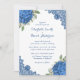 Invitaciones a bodas florales rusticas moradas y azules con flores de horangea azul, aliento de bebé y vegetación en un fondo blanco y claro decorado con encaje floral azul. Fondo morado en la parte posterior.