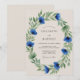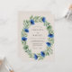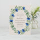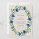 Una delicada corona de vibrantes flores azules reales y exuberante follaje verde rodea los elementos centrales. Este diseño evoca una atmósfera romántica y clásica, perfecta para una ocasión memorable. La paleta de colores prominentes presenta azules profundos y verdes terrosos.