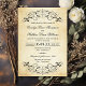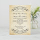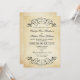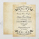 Una impresionante invitación de boda con florituras ornamentadas de volutas negras en un fondo de papel de pergamino envejecido con bordes cálidos y desgastados. El nombre de la escritura caligráfica y la tipografía serif refinada evocan el encanto de la correspondencia antigua para un ambiente verdaderamente antiguo. Todo el texto, incluidos los nombres, la fecha, la ceremonia y los detalles de la recepción, es totalmente editable.