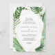 Esta tarjeta de invitación formal de matrimonio con formas geométricas de palmeras tropicales silvestres es perfecta para una boda en la playa o destino. El diseño presenta una exótica variedad de hojas de plátano de palmera de color agua verde, helechos, follaje, plantas botánicas y vegetación para un ambiente tropical de verano.