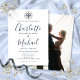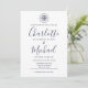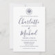 Con la característica brújula de un barco y nombres de estilo de firma, esta elegante invitación de boda náutica se puede personalizar con su información en elegante letra azul marino con la foto elegida en el reverso. Diseñado por Thisisnotme©