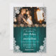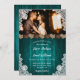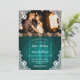 Elegante y romántico campo rústico verde azulado invitación a una boda con fotos de casamiento con corazones de burrega y encaje floral sobre un fondo rústico de madera.