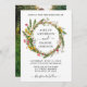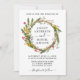 La invitación a la boda de flores silvestres de color acuático moderno incluye flores silvestres amarillas, rosas, púrpura, azules y blancas, hojas de eucalipto, pino y otras fuentes de vegetación botánica en una corona de madera de ramón. Incluye un guión elegante de caligrafía. Foto de vuelta.