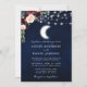 Invitación a la Boda Celestial. Cielo nocturno azul acuarela con luces de cuerda y la luna. Floral rosa azul borgoñona. La vegetación de las hojas de Eucalyptus. Foto de vuelta.