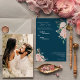 Esta exuberante marina floral nada de fantasía en el diseño de la invitación a la boda fotográfica presenta hermosos antecedentes clásicos de moda de rosa pastel y azul marino con una simple tipografía moderna y una elegante caligrafía para establecer un tono sofisticado para cualquier tipo de evento. Cada producto está adornado con hermosas rosas rosas rosas y melocotones e hidrangeas de marfil, adornadas con exuberantes detalles de eucalipto y hojas de vegetación, junto con marcos geométricos de oro intemporales para un lujoso look. Combina y combina esta colección de coordinación con una estética boda personalizada y sin esfuerzo para una amplia gama de estilos informales y formales. Para una mayor coordinación de diseños, este diseño también está disponible en blanco y negro. Como en todo nuestro diseño, si tiene alguna pregunta o petición especial, por favor pregunte.