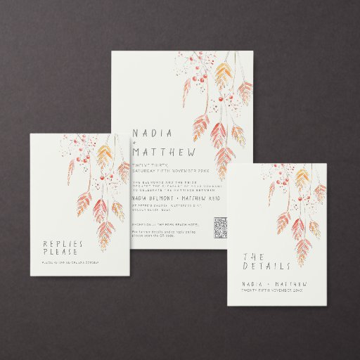 Dibujo simple y moderno y acuarela, invitación a la boda en otoño en tonos rojos, naranjas quemados, amarillos y grises sobre blanco crema. p Personaliza la invitación a la boda de otoño con tu propia foto de parejas al revés. Ideal para un simple boda otoñal. Edite esta invitación con sus propios nombres y detalles del boda. Hay otros elementos coincidentes disponibles. Grasas y bayas de otoño y dibujo de acuarelas sueltas de Sarah Trett para www.mylittleedenweddings.com