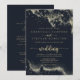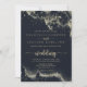 Esta invitación a bodas doradas con salpicaduras acuáticas es perfecta para un boda rústico. El diseño está decorado con un dorado pintado a mano y un fondo azul oscuro. Guarde el papel incluyendo más detalles en la parte posterior de la invitación en lugar de en una tarjeta separada.
