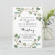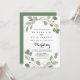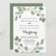 Este eucalipto geométrico de vegetación es ideal para una boda rústica. El diseño se compone de ramas de eucalipto botánico y verde a mano y de hojas que adornan un marco dorado elegante. Guarde el papel incluyendo más detalles en la parte posterior de la invitación en lugar de en una tarjeta separada.