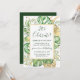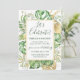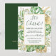 Esta elegante invitación de celebración de boda de fuga tropical presenta hojas de palma, filodendro y helecho en verde y dorado. Un elegante marco dorado resalta el texto en verde oscuro. Las salpicaduras de oro acentúan este diseño botánico exótico y aportan un toque de fantasía moderna a la invitación. "¡Celebremos!" junto con los nombres de los recién casados se presentan en la parte superior. Los detalles del voto matrimonial y la recepción están debajo. La información de RSVP está en el reverso de la invitación.