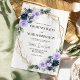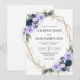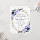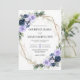 Esta invitación de boda presenta flores de lavanda suave y azul marino intenso acentuadas con vegetación fresca y un marco geométrico dorado moderno. Sus nombres y detalles de la boda resaltan claramente, enmarcados hermosamente por el borde floral para un ambiente elegante y romántico.