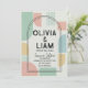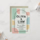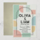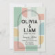 Establece el tono para tu celebración única con esta llamativa invitación de boda geométrica moderna de mediados de siglo. Con una paleta vibrante y sofisticada de verde menta, melocotón suave y amarillo mostaza, este diseño combina la inspiración retro con un toque contemporáneo. El diseño muestra formas abstractas audaces y un llamativo marco de doble arco que resalta elegantemente tus nombres y detalles del evento.