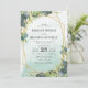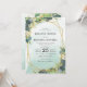 Invitaciones de boda de eucalipto con un fondo desgastado de acuarela rústica, una forma geométrica de purpurina dorada, hojas botánicas verdes elegantes, salpicaduras de lámina de oro falso y una plantilla de boda simple y fácil de personalizar.