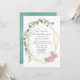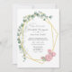 Vegetación geométrica a la moda de eucalipto y invitación a bodas de rosas rosas rosas rosas rubias con marco geométrico dorado y acuarela de menta a la inversa.