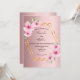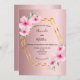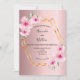 Una elegante invitación a bodas tropicales de verano. Con un marco geométrico de oro falso decorado con hibiscos rosa claro, flores tropicales con algo de vegetación. Un fondo metálico rosa fino y rubio. Los primeros nombres de la novia y del novio están escritos con un guión moderno de estilo manuscrito. Texto negro. Retroceso: fondo metálico color rosa falso.