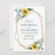 Un diseño floral de girasol con un marco geométrico con texto en el centro. Los girasoles, las flores blancas, las flores azules y los eucaliptos verdes son perfectos para sus bodas rústicas de verano y otoño. Puede cambiar la redacción, el tamaño del texto, el color y la fuente de esta plantilla. También se pueden cambiar los antecedentes de la Marina.