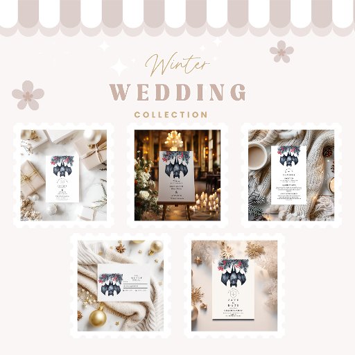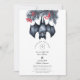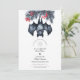 Un audaz ilustracion gótico con un murciélago acuático colgado al revés de pinos de invierno con bayas rojas. Este diseño inquietante y juguetón combina el capricho oscuro con el espíritu de las vacaciones, perfecto para bodas de invierno alternativas o góticas con un sentido del humor y el borde.