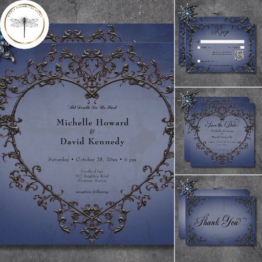 Invitación Boda gótico negro y azul de corazón filigrí