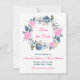 Esta hermosa tarjeta de guardar la fecha de boda con acuarelas de color rosa intenso y azul marino presenta una corona de rosas, hojas y ramas en tonos de azul, verde, marrón y dorado. El texto personalizable está en azul marino y rosa, y la parte posterior tiene un patrón general de flores y hojas en los mismos colores con una caja de texto azul marino y rosa con letras blancas para que puedas agregar información del sitio web de la boda si lo deseas.