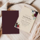 Esta moderna invitación a una boda española con flores de la marina borgoñona es perfecta para una celebración de bodas de destino. El diseño se compone de flores pintadas a mano y hojas verdes, rojas, burdeos, navales, violetas, azules y rubíes.