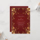Los ricos tonos de borgoña proporcionan un fondo profundo y lujoso para este diseño sofisticado. Los roleos florales ornamentados de tono dorado y las rosas estilizadas adornan los bordes con un sentido de elegancia regia. Perfecto para un evento otoñal formal, la obra de arte equilibra tonos metálicos cálidos con una estética temperamental y romántica.
