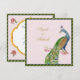 Elegante invitación de bodas de estilo vintage con pavo real acuático y detalles bodas en la parte posterior de una suave paleta de color rosa y verde. Perfecto para el boda indio moderno.