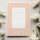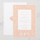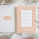 Esta exquisita invitación a la boda combina la esencia romántica del espíritu de diseño de William Morris con una paleta de color fresco y de flores de melocotón. Presenta un patrón botánico detallado en melocotón suave y crema, que capta los motivos ornamentales y orgánicos que son la firma del movimiento Artes y Artesanías. El diseño está enmarcado por un borde complementario, lo que crea un aspecto cohesivo e invitante. La selección de delicados tonos melocotón crea un ambiente cálido y acogedor, ideal para un boda primaveral o veraniego. El papel de alta calidad y la tipografía elegante realzan el ambiente lujoso de la invitación, y crean el escenario para una celebración de amor y compromiso.