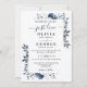 Esta elegante invitación de boda en azul marino y blanco con flores puede ser personalizada con su información en tipografía moderna y una foto especial en el reverso. Diseñada por Thisisnotme©