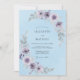 Un sereno fondo azul cielo establece un escenario tranquilo para este diseño floral invernal. Delicadas anémonas en acuarela en suaves tonos de lavanda y profundos tonos de púrpura están acentuadas por un etéreo follaje gris y plateado. Esta obra de arte botánica presenta elegantes hojas de eucalipto, creando una paleta sofisticada y romántica de tonos fríos para un evento estacional.