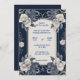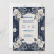 Haga una primera impresión impresionante con esta invitación a la boda floral azul y plateada de la Marina. Con elegantes diseños florales de marfil, esta invitación desborda la sofisticación y el encanto, perfecto para una boda intemporal y elegante