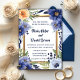 Esta invitación a la boda incluye un elegante marco floral con flores de melocotón azules y suaves, complementado con un frondoso follaje verde. Un borde geométrico dorado añade un toque de sofisticación. El centro en blanco ofrece espacio para el texto de personalizable, lo que lo convierte en perfecto para un boda moderno y romántico.