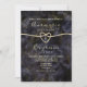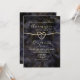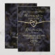 Elegante, boho, lujosa, moderna invitación de boda abstracta de geoda de mármol con dorado brillante y negro con monograma detrás, caligrafía de moda y corazón de cuerda dorada falsa.