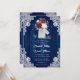 Rústica invitación a bodas azul marino, borgoñona y rubia con un ramo de aliento de bebé, rosas borgoñas y rosas rosa rubí dentro de un frasco de albañil contra un fondo de madera de granero azul adornado con encaje floral blanco y luces de centelleo. Diseño de tarjeta perfecto para invitar a sus invitados a su fiesta de bodas rústica azul marino, borgoña y ondulada.