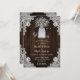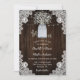 La rústica invitación a bodas del bebé por el aliento de un país con el aliento del bebé dentro de un frasco de albañil sobre un fondo rústico de madera adornado con encaje floral blanco y luces de cuerda. Personalice fácilmente nuestra rústica invitación a una boda floral rural para su país rústico, o fiesta de bodas en granero inspirada en flores del aliento del bebé.